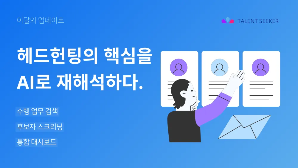 이번 업데이트는 헤드헌터의 전문성을 AI 기술로 구현한 결정체로, 기업이 채용에서 새로운 차원을 경험하도록 돕습니다. 지금 바로 탤런트시커의 업데이트를 확인하고, AI가 가져오는 채용 혁신을 만나보세요!