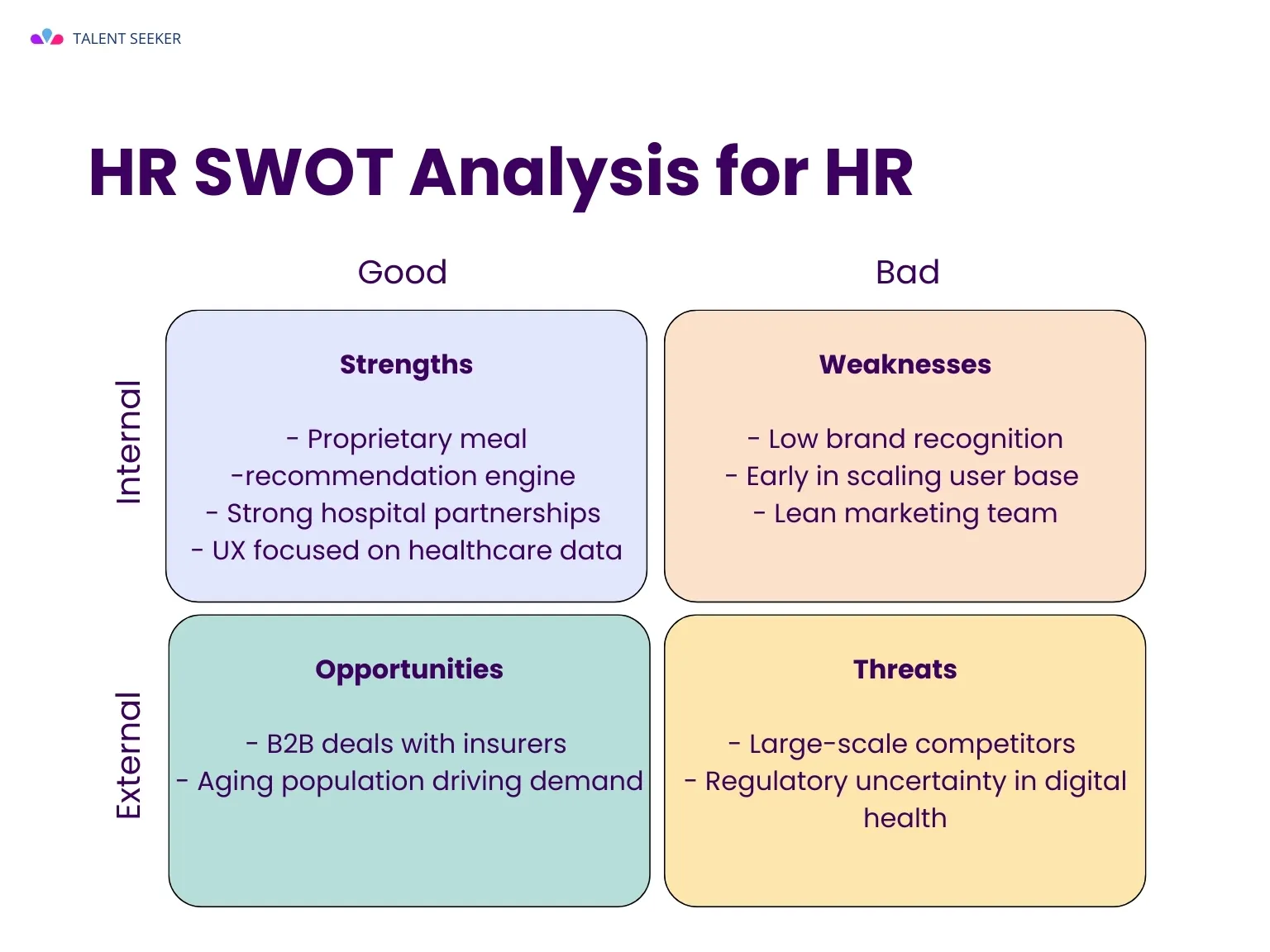 강점 (Strengths) | - 자체 개발한 식단 추천 알고리즘- 의료기관과의 안정적 제휴- 건강관리 데이터에 특화된 UX | 후보자에게 “우리는 실제 의료 데이터를 제품에 반영하고 있습니다”라고 설명 가능 |